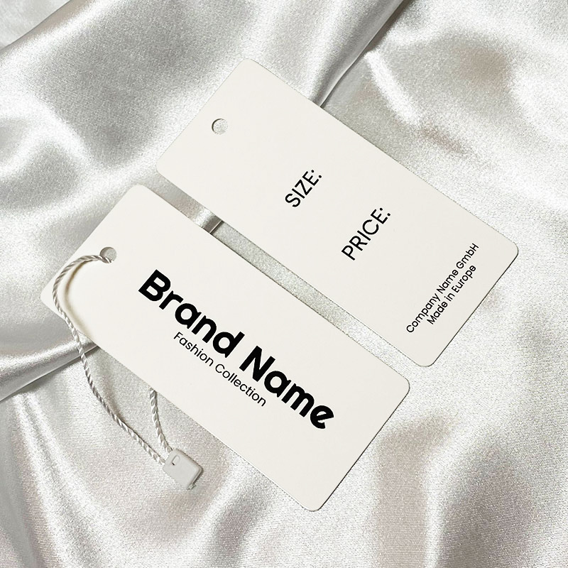 Kartonska etiketa z vrvico za obešanje za oblačila ali raznolike dodatke oblačilom, personalizirana z imenom blagovne znamke ali logotipom, ter tudi drugimi informacijami o izdelku, natisnjenih na obeh straneh. Ta vrsta etikete za obešanje je izdelana iz visokokakovostnih materialov z uporabo najnaprednejših tehnologij na področju digitalnega tiska in dodelave.
