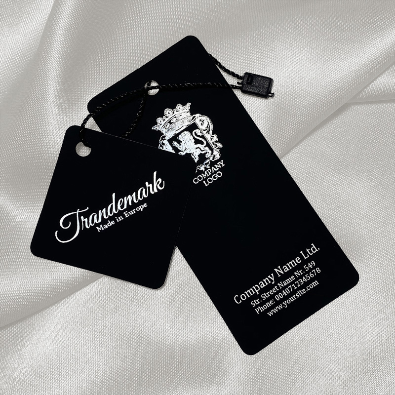 Set, sestavljen iz 2 čudovitih kartonskih etiket, vključno s pečatom z vrvico za oblačila, narejenih iz črnega Soft Touch laminiranega kartona in personalizirani s srebrno folijo tipa Digital Hot Stamp. Ta vrsta etikete za obešanje je izdelana iz visokokakovostnih materialov z uporabo najnaprednejših tehnologij na področju digitalnega tiska in dodelave.