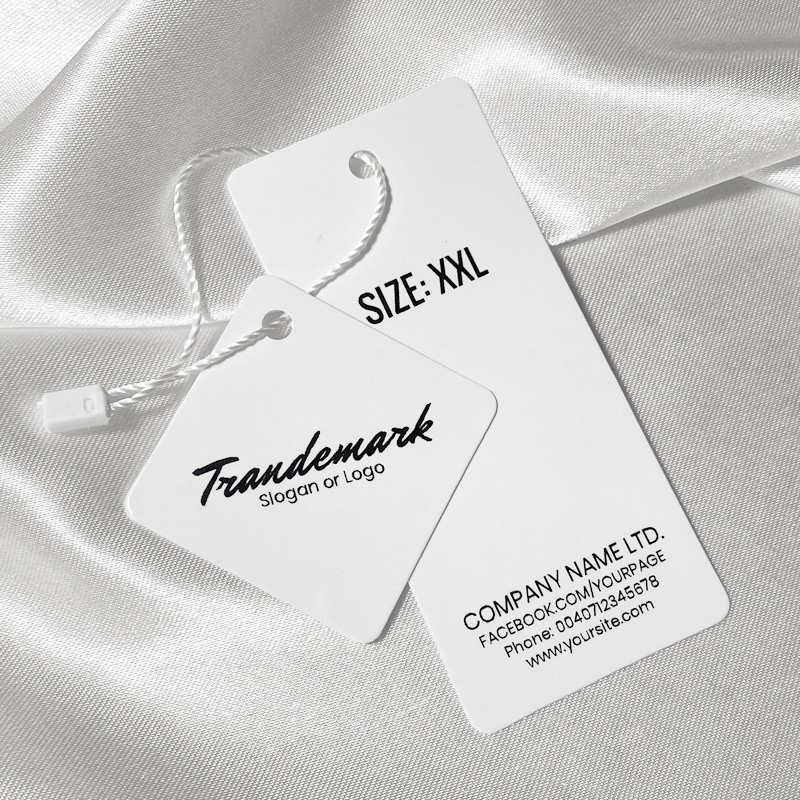 Kartonske etikete za oblačila z belim pečatom, narejene iz debelega laminiranega kartona z bleščečo folijo in personalizirane z besedilom ali logotipom blagovne znamke. Ta vrsta etikete za obešanje je izdelana iz visokokakovostnih materialov z uporabo najnaprednejših tehnologij na področju digitalnega tiska in dodelave.