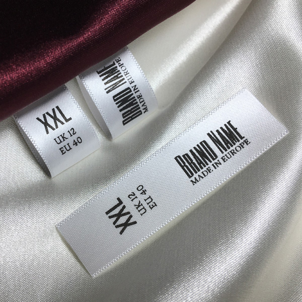 Tekstilna etiketa, tiskana z besedili in velikostmi po meri na satensko tkanino, rezana glede na podane dimenzije.